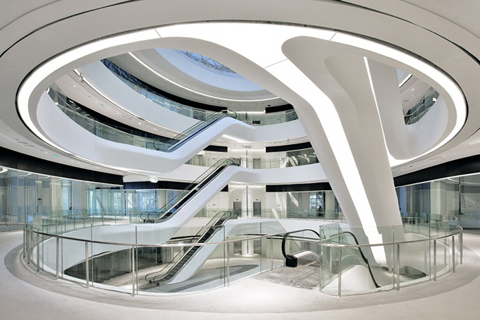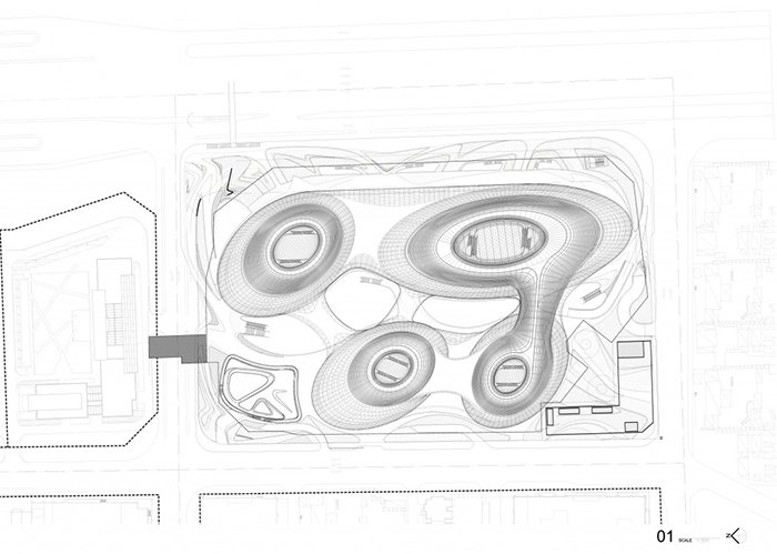 設(shè)計的一個主題是借鑒中國院落的思想,創(chuàng)造一個內(nèi)在世界。而同時,這又是一個完全二十一世紀(jì)的建筑:不再是剛硬的矩形街區(qū)及街區(qū)之間的空間,而是通過可塑的、圓潤的體量的相互聚結(jié)、溶合、分離以及通過拉伸的天橋再連接,創(chuàng)造了一個連續(xù)而共同進化的形體以及內(nèi)部流線的連續(xù)運動。