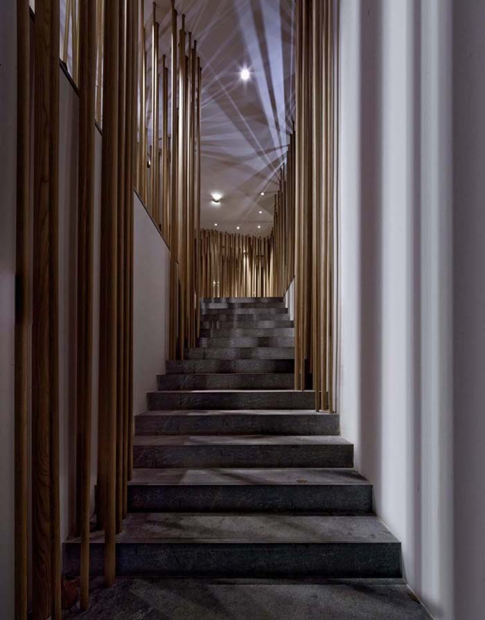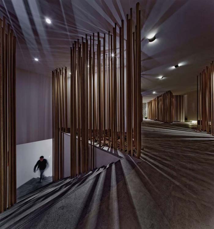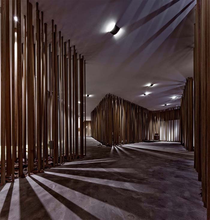 公共走道的設(shè)計材料選用了1800多根貼木皮圓管和上百斤的干樹葉,設(shè)計師希望讓整個方案由平面生長為一個立體的空間,一個有回憶、有林、有路、有家、有記憶的空間。