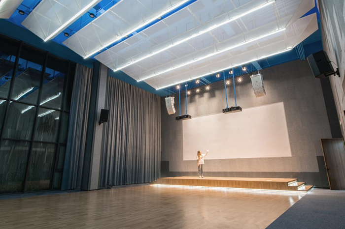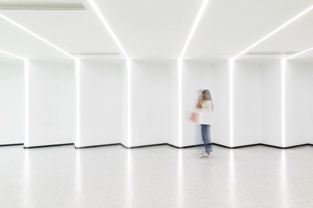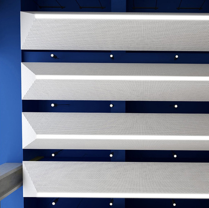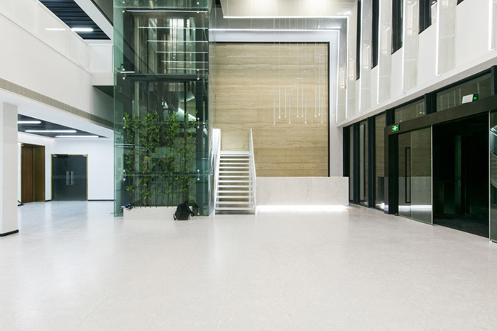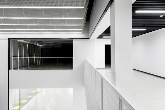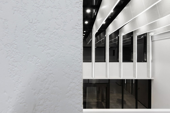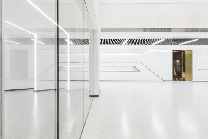 由于原場地為半透的玻璃建筑,且大堂頂部有裸露的玻璃構(gòu)成,為了優(yōu)化場地的采光環(huán)境,在大堂頂部加設(shè)有垂直百葉,光線透過玻璃時,根據(jù)不同時間不同季節(jié)的光照角度形成不同長寬的條形陰影,以此調(diào)節(jié)室內(nèi)采光,避免室內(nèi)光線太強或者遮擋過多影響室內(nèi)外景觀的通透性。同時,將原有的隔間打通,用落地玻璃替代原有的墻結(jié)構(gòu),構(gòu)成開放式的辦公空間,并將自然光線延伸至室內(nèi)。解決了場地進深大、內(nèi)部接觸不到自然光的問題,最大限度地利用了自然資源。