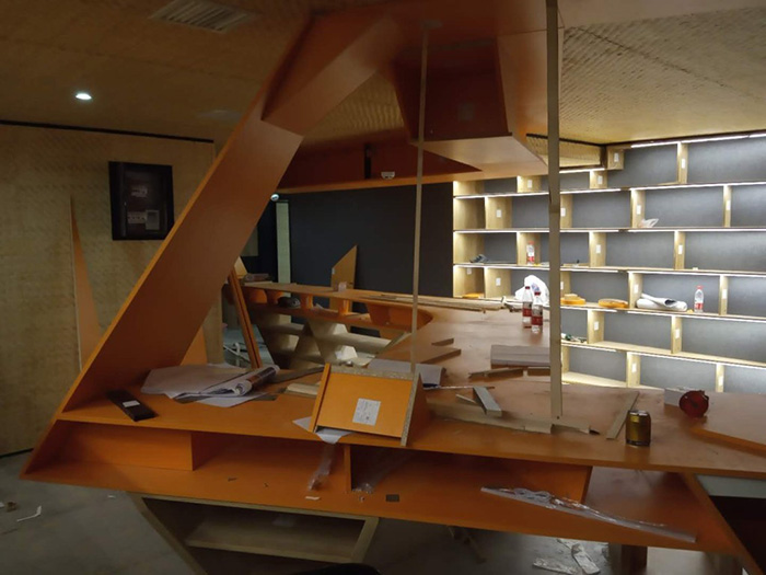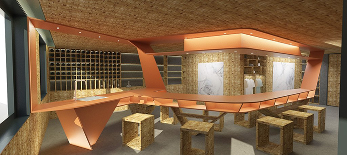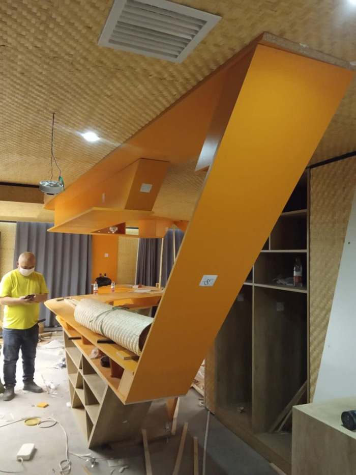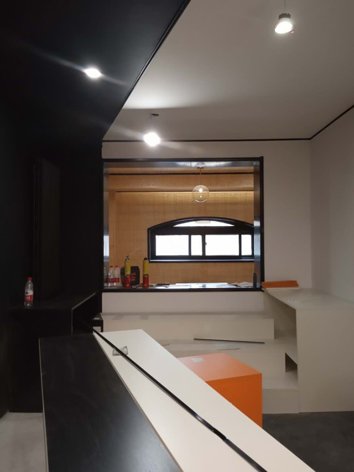 這個項目是朋友邀約的會所室內(nèi)設(shè)計。使用壁布,竹席,涂料等材料,以30萬左右的造價來實現(xiàn)大廳,樓梯間,辦公,餐廳,廚房等不同空間的不同體驗。這個項目目前已經(jīng)接近竣工。大廳的吧臺是一個家具,也是一個裝置藝術(shù),由作為空間劃分的手段。