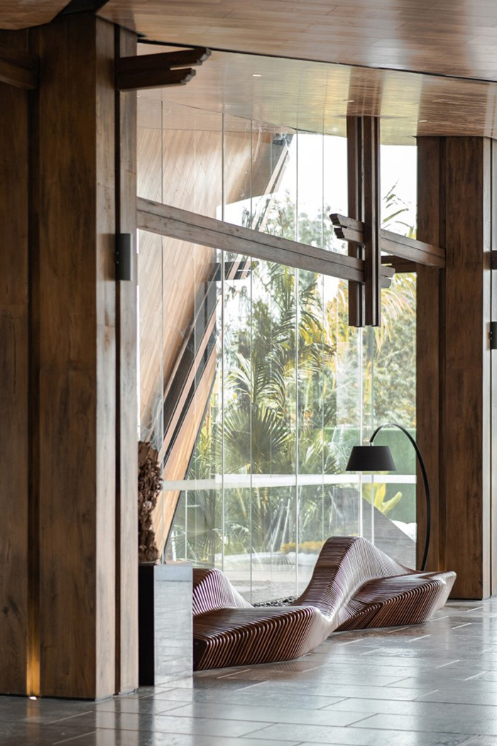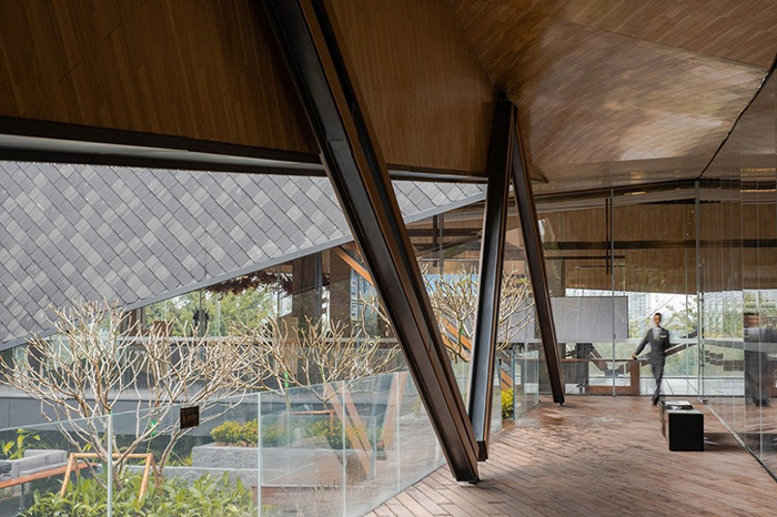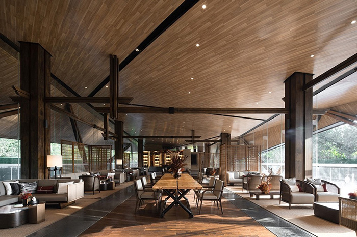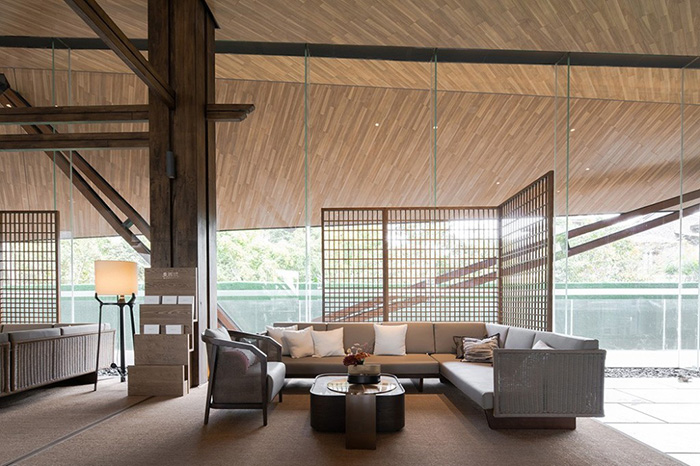 建筑設(shè)計通透開放,自由的屋頂結(jié)合靈活的異形結(jié)構(gòu),同生機勃勃的自然環(huán)境相融共生。室內(nèi)延續(xù)建筑所賦予的意義,以其為載體,在室內(nèi)空間延展、重組,詮釋其所構(gòu)成的涵義。